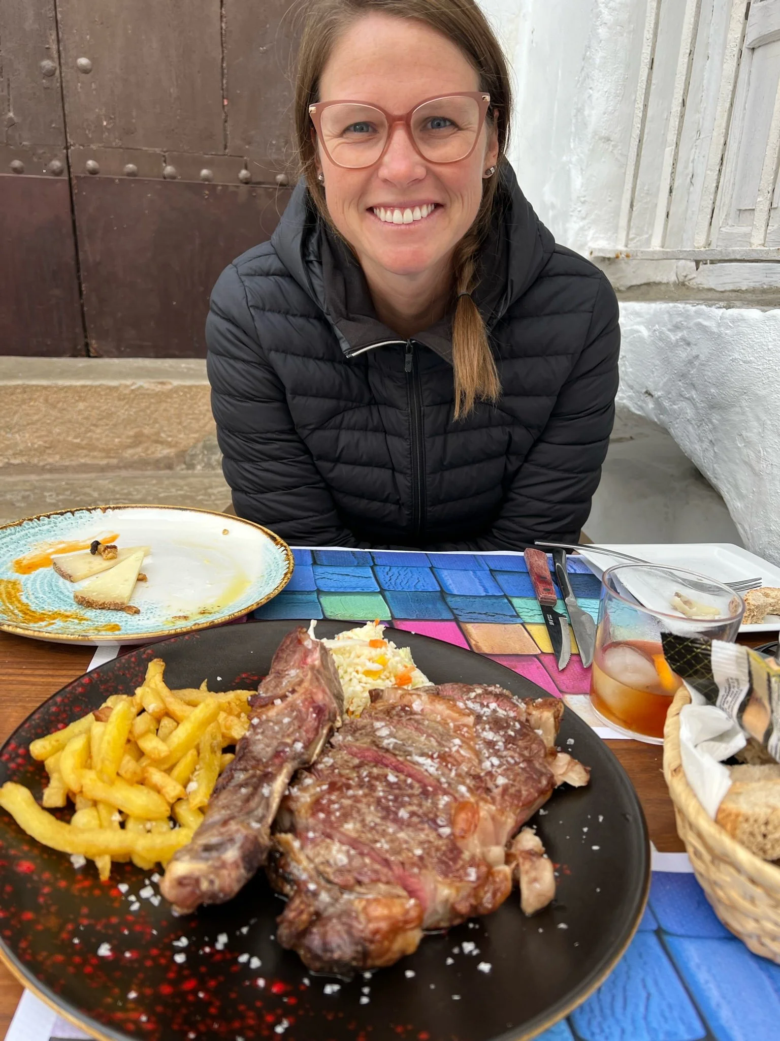 Taking the road from Ronda to Seville we stopped at a little town my Grandma recommended called Arcos de la Frontera with sweeping views of the valley below. The town is built on top of a hill with churches Christians built on top of former mosques and stacked white houses with navy blue accents. It was the perfect rest break for lunch and a walk… and Winston got spoiled at Gastrobar El Retablo where he helped us eat a ribeye steak and frites! We had no intention of ordering steak but the waitress was insistent once she saw Winston!